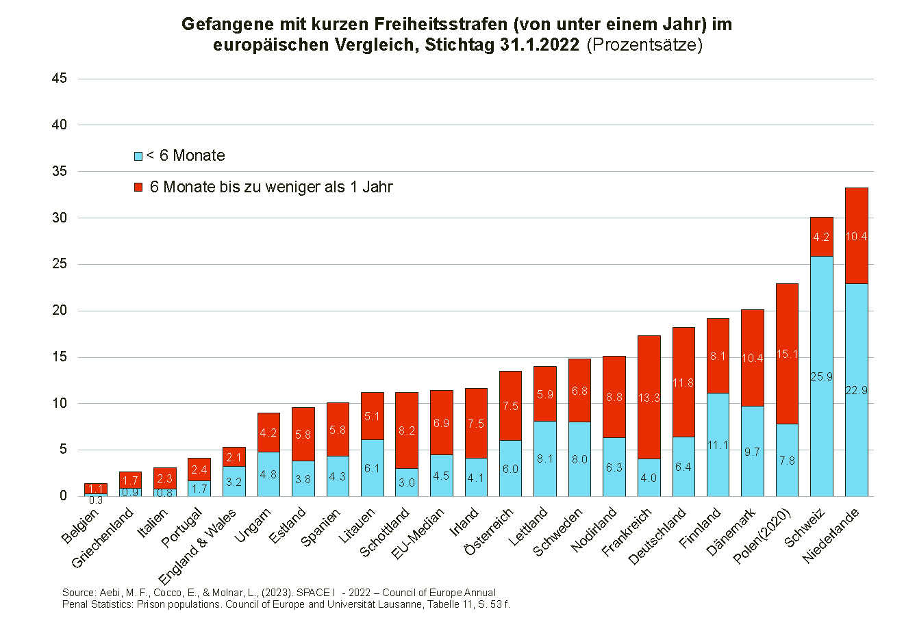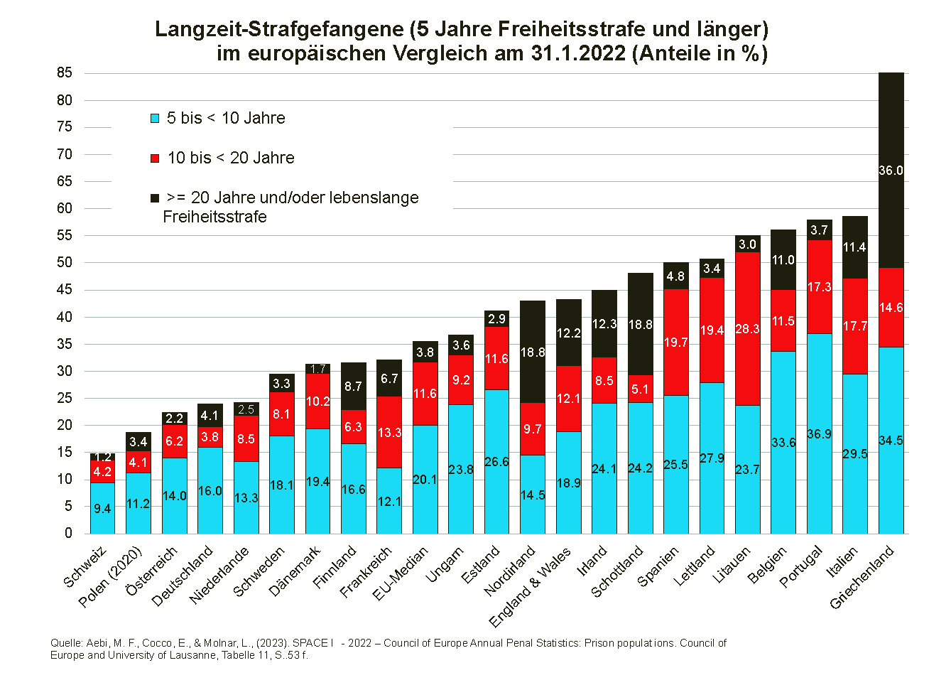 Das Potential für eine reduktionistische Kriminalpolitik zur Verringerung von Gefangenenraten liegt dagegen weniger auf der Ebene des Langstrafenvollzugs, der stichtagsbezogen nur 15% der Gefängnisinsassen in der Schweiz ausmacht. Reformen in Belgien, Portugal, Italien oder Griechenland müssten sinnvollerweise eher im Langstrafenvollzug ansetzen, und zwar sowohl auf der gerichtlichen Ebene der Verhängung von Freiheitsstrafen («Front-door») als auch bei der Strafrestaussetzung zur Bewährung (bedingte Entlassung, «Back-door»).