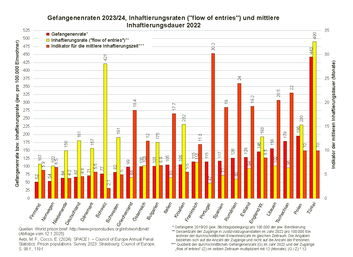 Gefangenenraten werden häufig als Indikator der Punitivität in einer Gesellschaft gewertet. Sie variierten 2023/2024 in Europa zwischen 36 und 71 pro 100’000 der Wohnbevölkerung in den skandinavischen Ländern und mehr als 250 bis zu 443 in einigen osteuropäischen Ländern bzw. der Türkei. In den letzten 25 Jahren gab es teilweise gegensätzliche Entwicklungen. Deutlichen Anstiegen in etlichen west- und auch osteuropäischen Ländern steht ein Rückgang oder eine stabile Entwicklung in ebenso vielen anderen Ländern gegenüber. Die Schweiz scheint auf den ersten Blick insofern unproblematisch, als sie seit ca. 30 Jahren relativ stabil bei nur geringen Schwankungen unterdurchschnittliche Gefangenenraten hat. Sie zeigt allerdings problematische Strukturmerkmale, indem sie den höchsten Anteil kurzer Freiheitsstrafen im europäischen Vergleich vollstreckt, eine überdurchschnittliche Untersuchungshaftrate und von der Insassenstruktur her einen extrem hohen Ausländer:innenanteil aufweist. Deshalb ist die Schweiz ein Beispielsfall für erfolgversprechende Strategien zur Senkung der Gefangenenraten, hier insbesondere durch die Ersetzung kurzer Freiheitsstrafen einerseits und durch die Verkürzung und Vermeidung von U-Haft andererseits, um unnötigen Freiheitsentzug zu vermeiden.