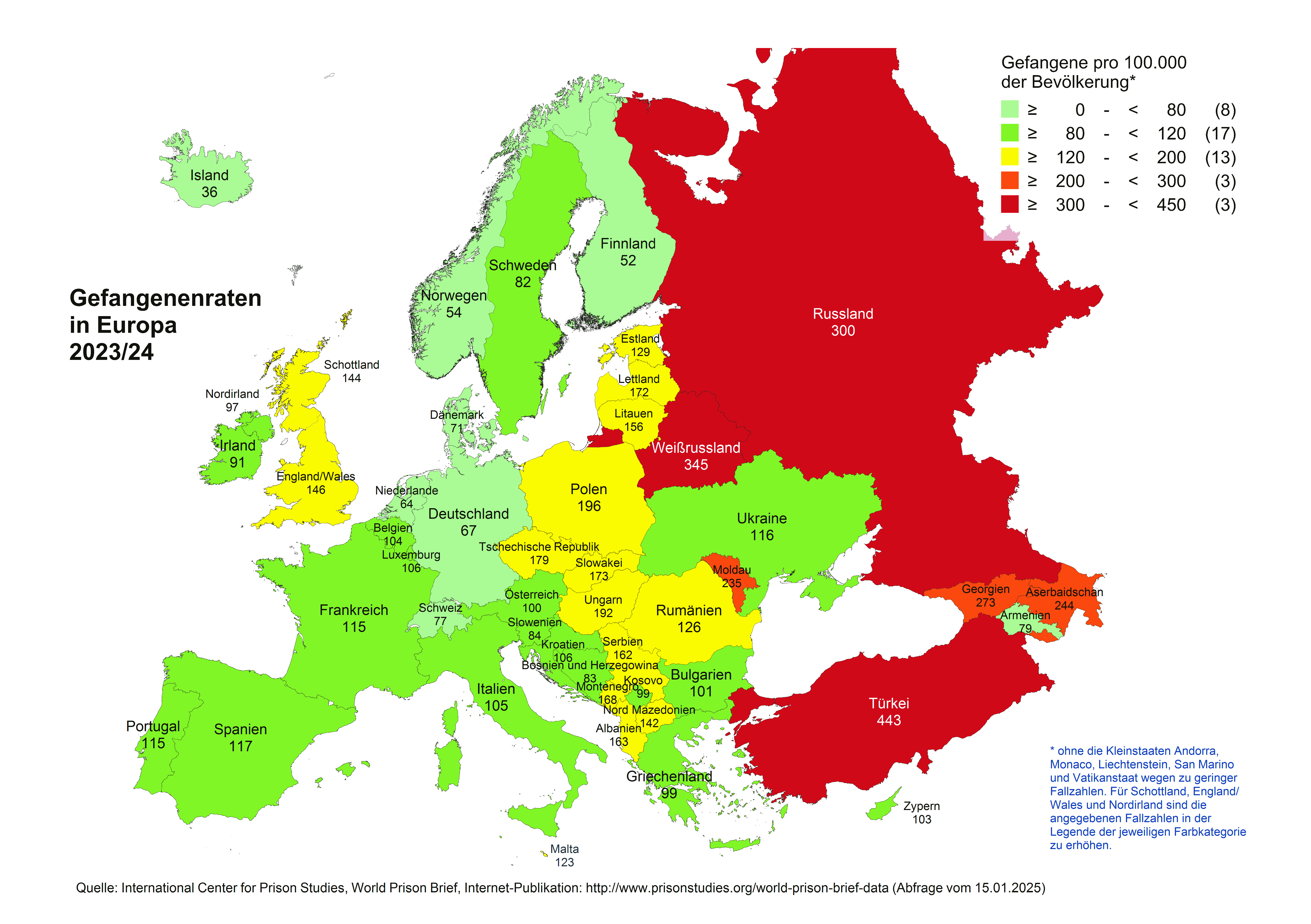 Man kann auf der einen Seite Länder unterscheiden mit sehr niedrigen Gefangenenraten (bis zu 80 pro 100’000 der Bevölkerung) wie Island (36) und die skandinavischen Länder (Finnland: 52; Norwegen: 54; Dänemark: 69), ferner die Niederlande (64), Deutschland (67), die Schweiz (77) und Armenien (79). Bezeichnenderweise befinden sich in dieser Gruppe aus Osteuropa nur wenige Länder (Bulgarien, Slowenien).
