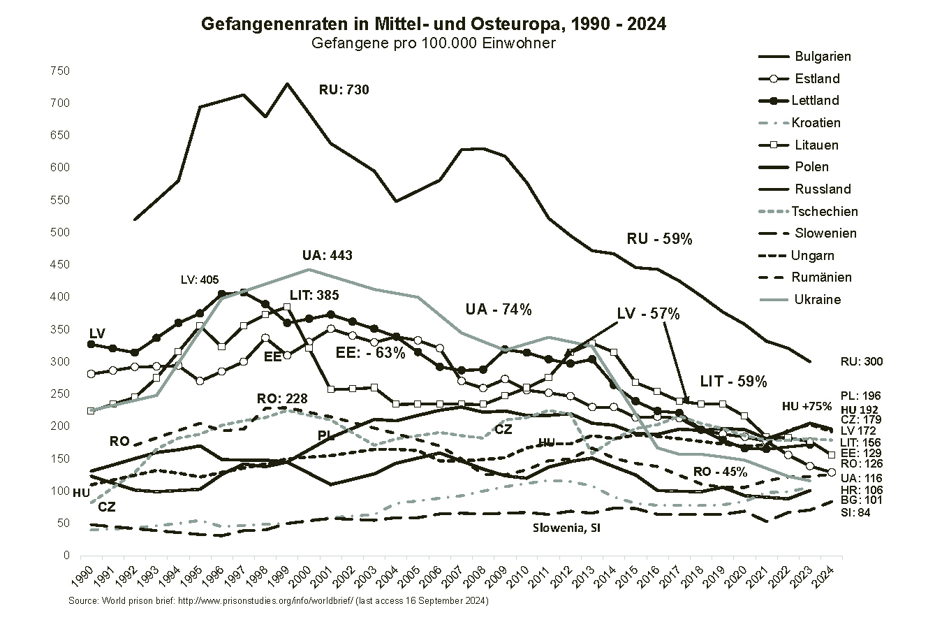 In Estland haben die Einführung der Verbüßung eines Strafrests i.V.m. elektronisch überwachtem Hausarrest (seit 2007) und andere kriminalpolitische Maßnahmen zur Reduzierung der Gefangenenraten beigetragen (2023: 129; 2001 noch 351, das bedeutet -63%). Auch Lettland gelang es, seine sehr hohe Gefangenenrate in ähnlichem Umfang von 407 (1997) auf 172 im Jahr 2023 zu reduzieren (-57%).